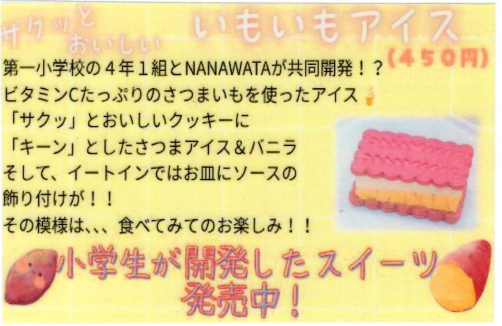 NANAWATAでは、昨年度に引き続き、子どもたちが考案したさつまいもスイーツを具現化・販売する、コラボレーションをさせていただきました。